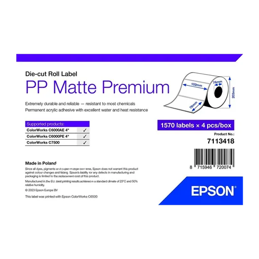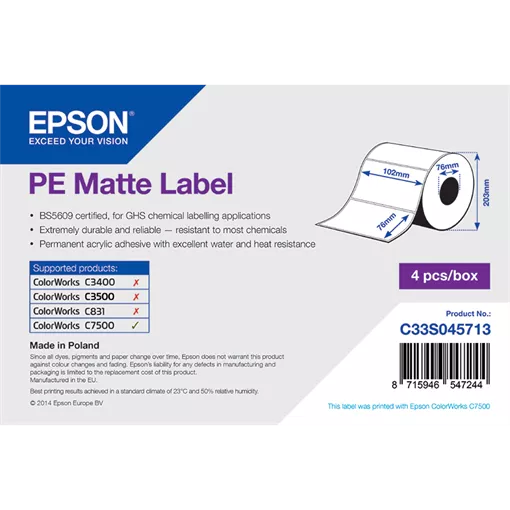 Címke szélesség: 102 mm • Címke magasság: 76 mm • Címke alapanyag: Műanyag • Tekercs belső átmérője: 76 mm • Ragasztó típusa: Normál • Szín: Fehér